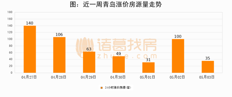 根据诸葛找房数据显示,青岛24小时涨价房源量为35套,较05月02日减少65套,环比下降65%。与此同时,涨价房源占比小幅回落,对于购房者来说是一个入市窗口期,购房者可抓住时机入市。