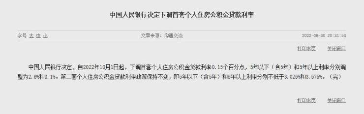9月30日,据中国人民银行网站,中国人民银行决定,自2022年10月1日起,下调首套个人住房公积金贷款利率0.15个百分点,5年以下(含5年)和5年以上利率分别调整为2.6%和3.1%。第二套个人住房公积金贷款利率政策保持不变,即5年以下(含5年)和5年以上利率分别不低于3.025%和3.575%。
