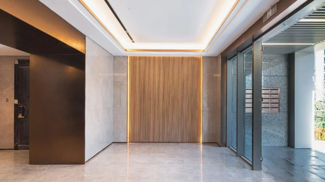 入户大堂,门口设置logo景墙,提升品质感的同时为业主提供便利指引;让客户亲身体验从社区到家的归心路径,预鉴美好居家旅途。