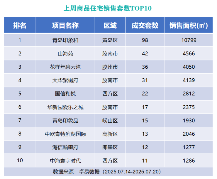 此外,大华紫樾府、国信和悦、华新园爱乐之城、青岛印象品、中欧青特滨湖国际、海信翰墨府和中海寰宇时代等项目进入销售榜前十位。上周青岛新建商品住宅成交前十榜单中,西海岸新区有四个项目上榜,主城区有三个项目上榜。