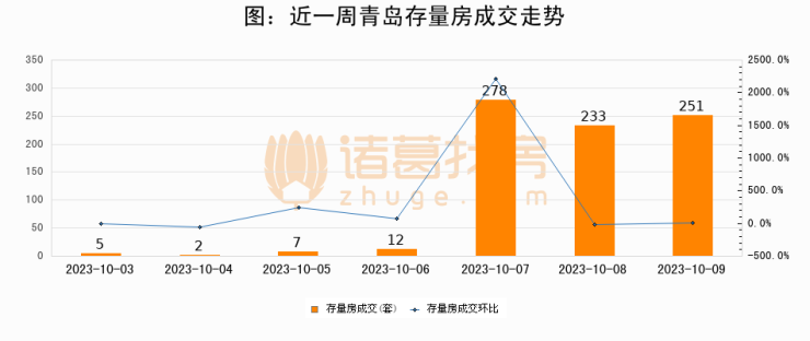从存量房来看,2023年10月09日青岛存量房单日成交251套,比昨日增加18套,环比上涨7.7%。从近一周存量房成交来看,青岛存量房日均成交套数为112套,10月09日单日成交251套,高于近一周平均水平124.1%。