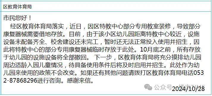 对于这个变更,城阳区教育局的解释是“临时存放康复器械”,并表示“十月底前会清退”。乍一看,好像有理有据,但细细琢磨却漏洞百出。首先,幼儿园的用途更改是否合规?这可是当初购房的关键条件之一,如今却轻描淡写地变成了“特殊教育中心”,难道不需要经过小区业主的同意吗?其次,即便是临时使用,为什么不在开始时就通知业主们,给大家一个合理的解释,而是等到装修动静搞得沸沸扬扬才回应?