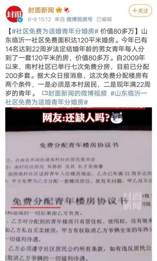 近日,山东一社区免费为适婚青年分配婚房的新闻,成功让不少异地同龄的适婚青年羡慕了。