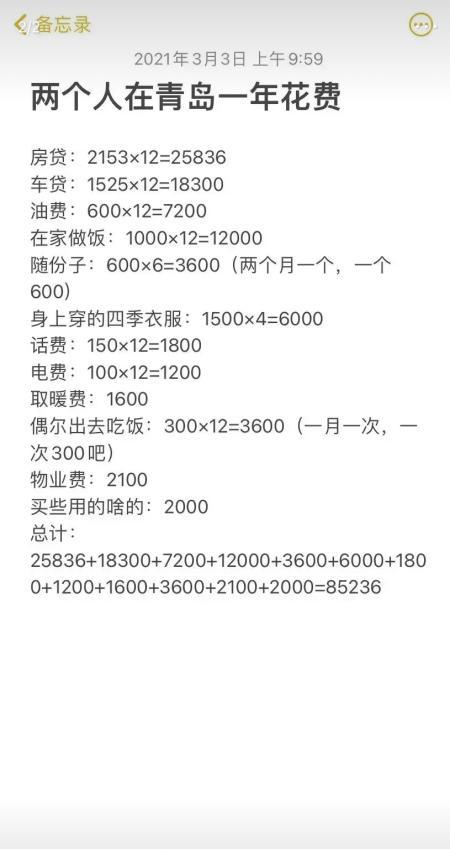 此前,有网友投稿夫妻二人在青岛的开销明细,有房有车无娃的小两口,一年开销要在8.5万左右。