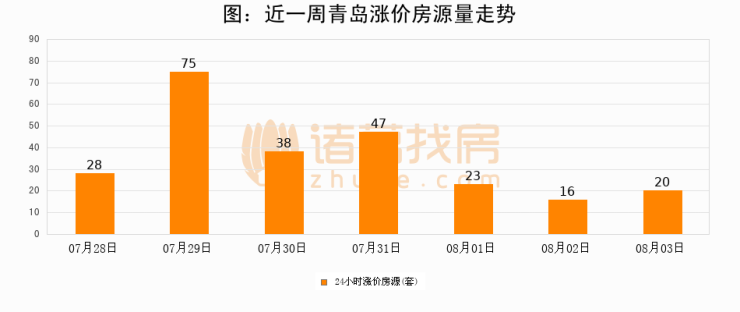 根据诸葛找房数据显示,青岛24小时涨价房源量为20套,较08月02日增加4套,环比上涨25%。与此同时,涨价房源占比小幅扩大,业主信心有所提升。