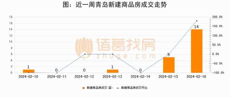 根据青岛市住房和城乡建设局数据显示,2024年02月16日青岛新建商品房成交14套,较昨日增加9套,环比上涨180%