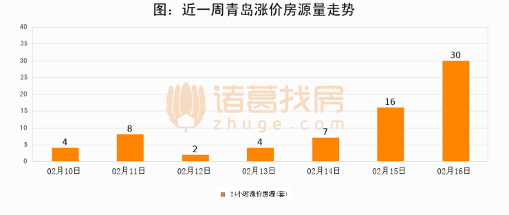 根据诸葛找房数据显示,青岛24小时涨价房源量为30套,较02月15日增加14套,环比上涨87.5%。与此同时,涨价房源占比小幅扩大,业主信心有所提升。