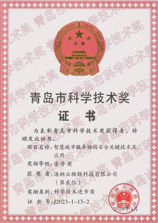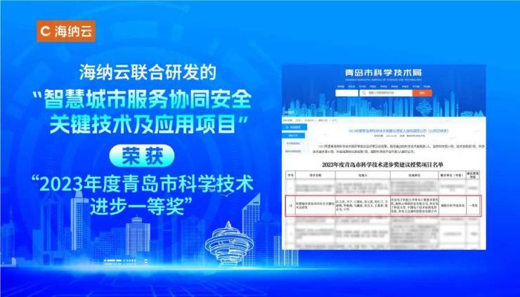 海纳云联合西安电子科技大学青岛计算技术研究院等共同研发的“智慧城市服务协同安全关键技术及应用项目”成功荣获“2023年度青岛市科学技术进步一等奖”。这也是海纳云继获得“2021年度青岛市科学技术进步二等奖”“2023年度山东省技术发明二等奖”之后,科技创新能力再获政府与行业权威认可。