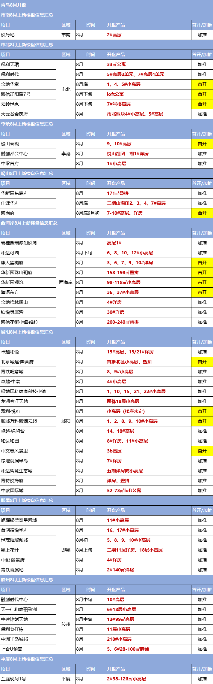 据不完全统计,8月青岛全市预计有50盘上新,以加推盘为主37盘之多,仅有13个新盘入市。推盘集中在城阳各板块,足足有15盘之多,碾压西海岸等其他近郊热区。主城三区8月发力,市北、李沧和崂山将有12盘推量,看点十足。
