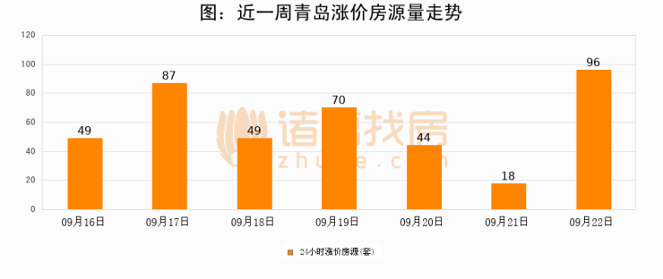 根据诸葛找房数据显示,青岛24小时涨价房源量为96套,较09月21日增加78套,环比上涨433.3%。与此同时,涨价房源占比小幅扩大,业主信心有所提升。