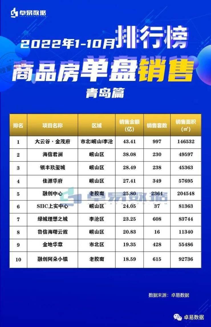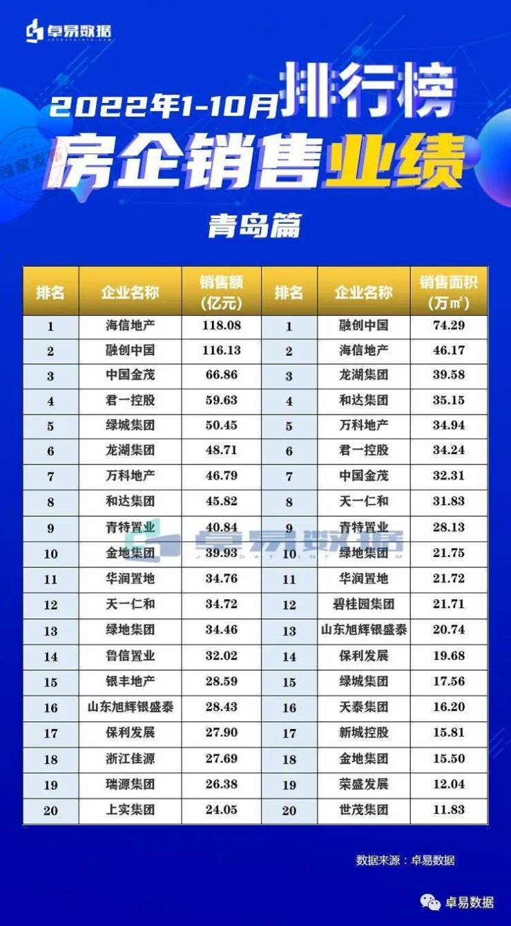 以下是2022年1-10月青岛房地产TOP20具体销售情况以及单盘销售情况。