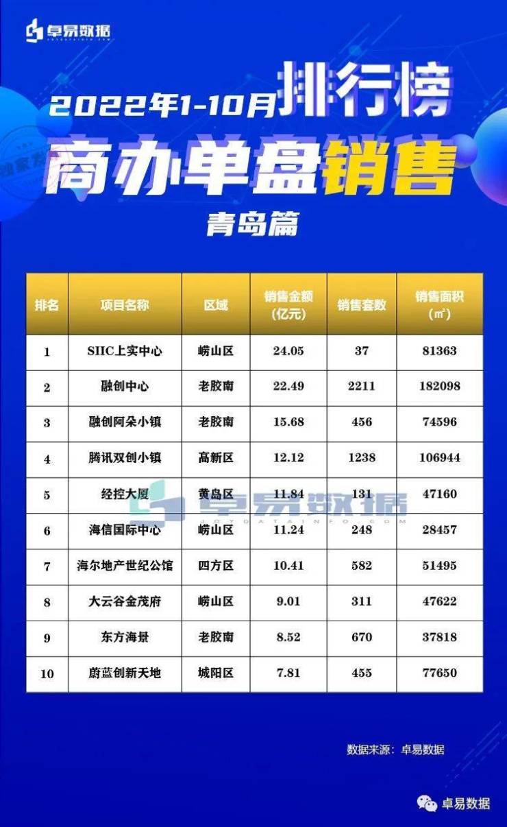商办市场中,TOP10网签133.18亿,其中崂山区的上实中心网签24.05亿,融创中心22.49亿,融创阿朵小镇15.68亿,腾讯双创小镇12.12亿,经控大厦11.84亿。