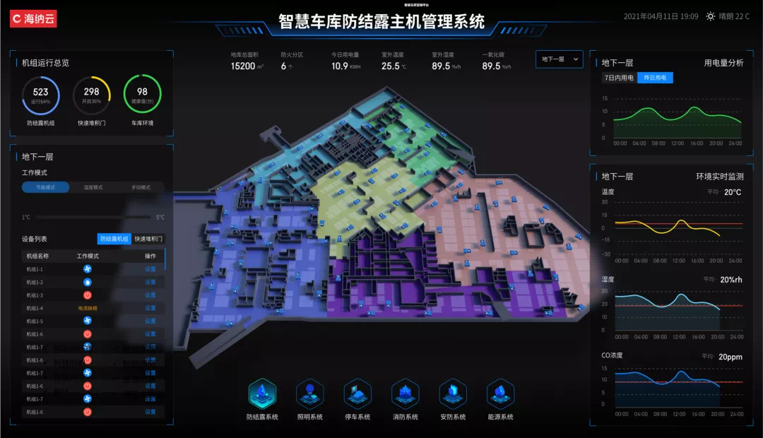 “智能防结露机组”是海纳云智慧车库场景的自研产品,其针对地下车库潮湿结露难点而研发,采用物联网传感器数据采集技术、LoRaWAN无线数据传输技术,实现车库内环境数据的精准实时采集,采用结露点计算公式,实现车库内结露点临界值的实时计算,将结露防控于未然。据统计,与传统人工和定时除湿机相比,海纳云智能防结露机组不仅效果好,还实现节能30%以上,而且自动启动,节约人工成本,以实际行动助力国家“双碳”战略。