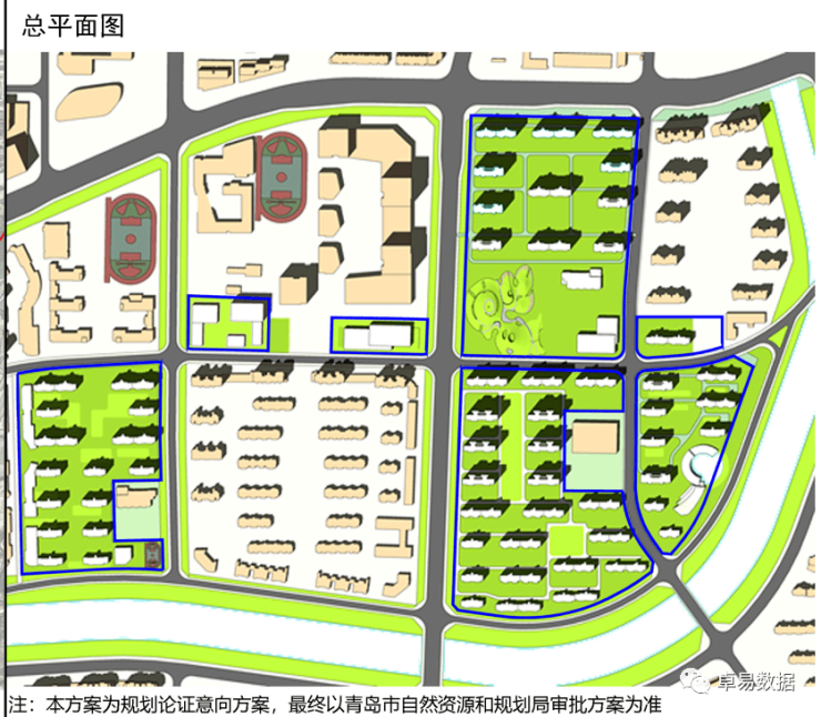 李村河西侧的商业商务混合用地调整为住宅和医疗卫生用地,其中住宅占地2.43万㎡,容积1.9,建面4.62万㎡。