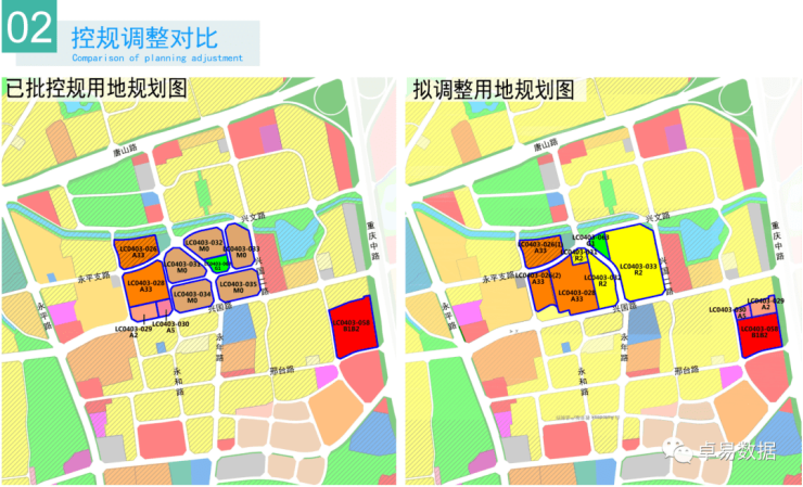 原控规10宗地为新型产业用地、中小学用地、医疗用地以及商务商业混合用地,调整后增加了3宗居住用地,3宗地约15万㎡。