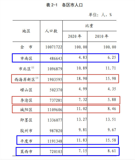 而且,根据青岛统计局发布的各区人口来看,拥有发展、政策红利的西海岸新区、李沧区和城阳区在十年间人口有了大幅度的增长外,市南、平度和莱西的人口比重则明显下降。