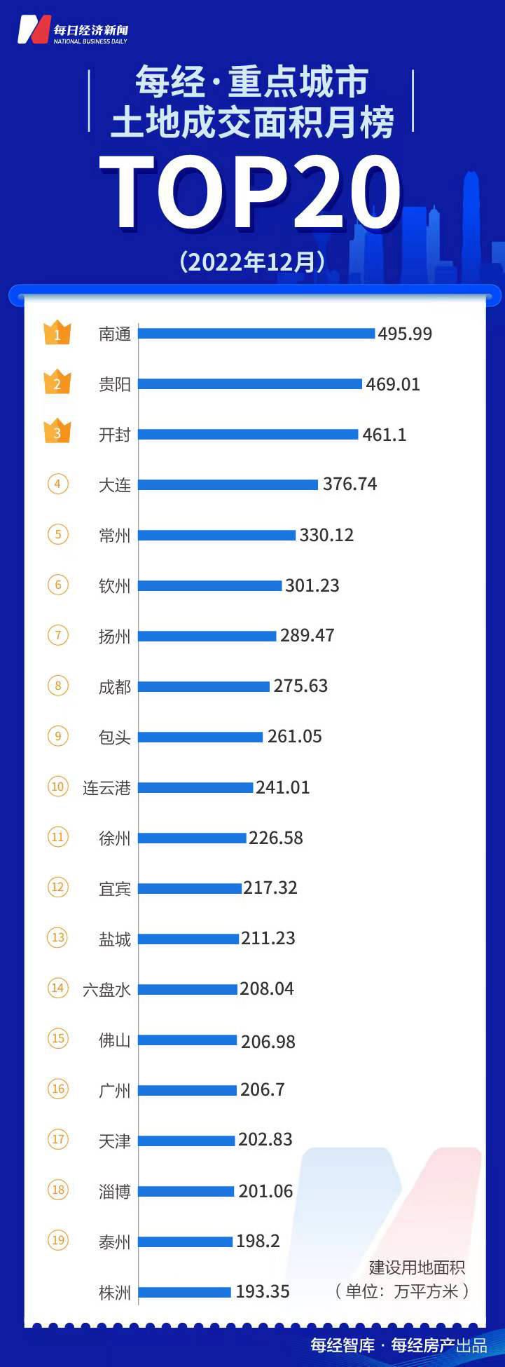从土地成交面积榜来看,12月份土地出让面积TOP20城市累计出让面积5578万平方米,超过11月份4012万平方米成为全年最高的月份。南通以496万平方米稳居榜首。