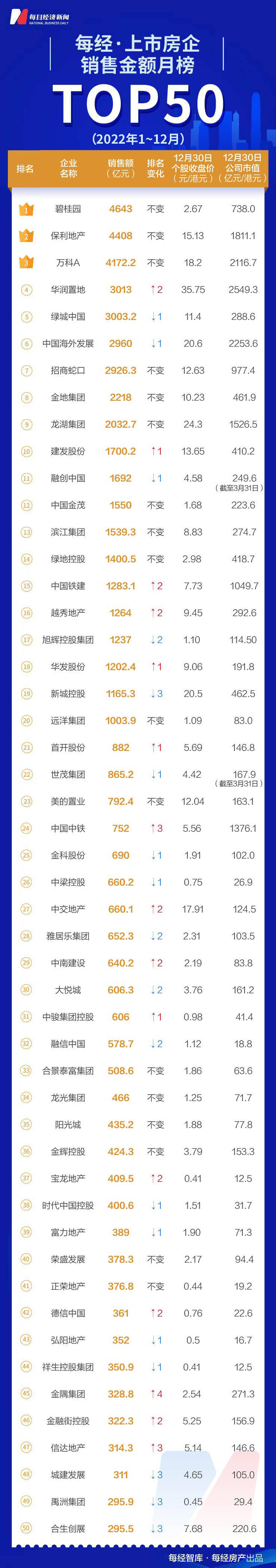 碧桂园、保利、万科拿下前三甲 建发杀入前十:上市房企2022年终排名落定
