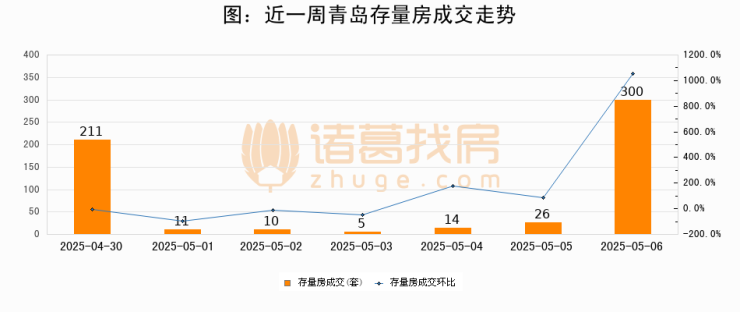 从存量房来看,2025年05月06日青岛存量房单日成交300套,比昨日增加274套,环比上涨1053.9%。从近一周存量房成交来看,青岛存量房日均成交套数为82套,05月06日单日成交300套,高于近一周平均水平265.9%。