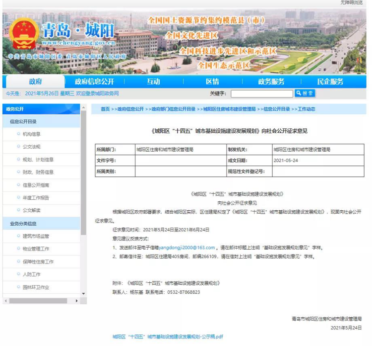 《城阳区“十四五”城市基础设施建设发展规划(公示稿)》,近日面向社会公开征求意见。