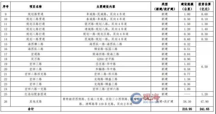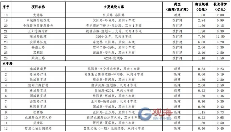 根据公示稿,“十四五”期间,城阳区计划建设道路项目200余项,计划总投资约241.7亿元。其中,主干路26条(新建18条,改扩建8条),次干路47条(新建37条,改扩建10条)。