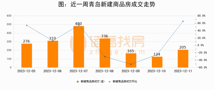 根据青岛市住房和城乡建设局数据显示,2023年12月11日青岛新建商品房成交205套,较昨日增加81套,环比上涨65.3%