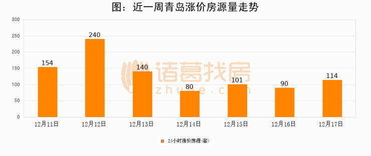 根据诸葛找房数据显示,青岛24小时涨价房源量为114套,较12月16日增加24套,环比上涨26.7%。与此同时,涨价房源占比小幅扩大,业主信心有所提升。