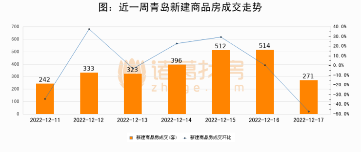 根据青岛市住房和城乡建设局数据显示,2022年12月17日青岛新建商品房成交271套,较昨日减少243套,环比下降47.3%。近一周青岛新建商品房日均成交371套,其中,12月16日成交量最高为514套。12月17日单日成交271套,低于近一周平均水平27%。