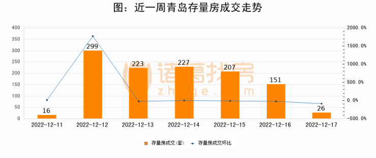 从存量房来看,2022年12月17日青岛存量房单日成交26套,比昨日减少125套,环比下降82.8%。从近一周存量房成交来看,青岛存量房日均成交套数为164套,其中12月12日成交量最高为299套,12月17日单日成交26套,低于近一周平均水平84.1%。