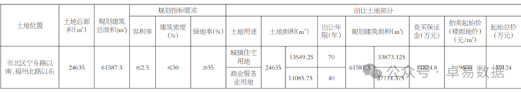 地块位于市北区宁乡路以南、福州北路以东。商住用地,商住比45:55,占地面积约24635㎡,容积率2.5,规划建筑面积61587.5㎡,建筑密度30%,绿地率35%,起拍楼面地价9600元/㎡,起拍总价5.91亿。竞买保证金1.18亿元,比例20%。