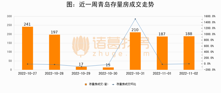 从存量房来看,2022年11月02日青岛存量房单日成交188套,比昨日增加1套,环比上涨0.5%。从近一周存量房成交来看,青岛存量房日均成交套数为150套,其中10月27日成交量较高为241套,11月02日单日成交188套,高于近一周平均水平25.3%。