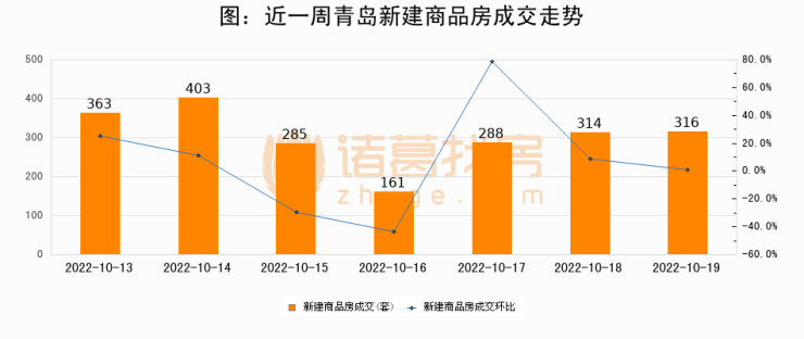 根据青岛市住房和城乡建设局数据显示,2022年10月19日青岛新建商品房成交316套,较昨日增加2套,环比上涨0.6%