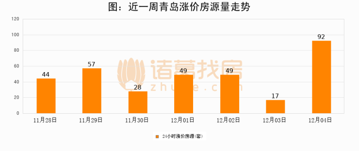 根据诸葛找房数据显示,青岛24小时涨价房源量为92套,较12月03日增加75套,环比上涨441.2%。与此同时,涨价房源占比小幅扩大,业主信心有所提升。