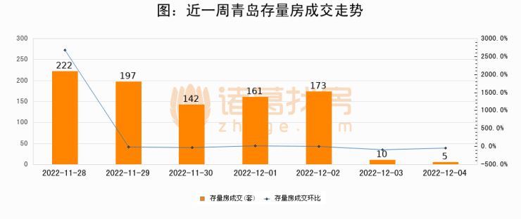 从存量房来看,2022年12月04日青岛存量房单日成交5套,比昨日减少5套,环比下降50%。从近一周存量房成交来看,青岛存量房日均成交套数为130套,其中11月28日成交量最高为222套,12月04日单日成交5套,低于近一周平均水平96.2%。