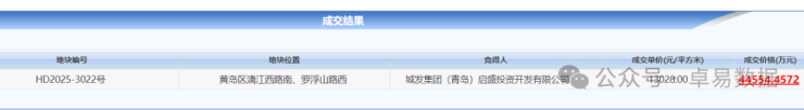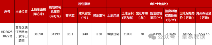 地块位于黄岛区漓江西路南、罗浮山路西,占地面积约31090㎡,容积率1.1,建面约3.42万㎡,建筑密度28%,绿地率40%,起拍楼面地价13028元/㎡,起拍总价4.46亿,竞买保证金2.22亿,比例为50%。