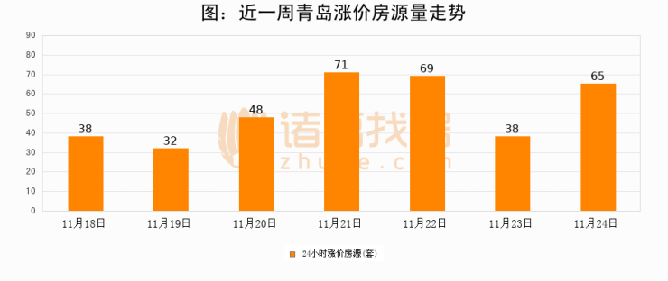 根据诸葛找房数据显示,青岛24小时涨价房源量为65套,较11月23日增加27套,环比上涨71.1%。与此同时,涨价房源占比小幅扩大,业主信心有所提升。