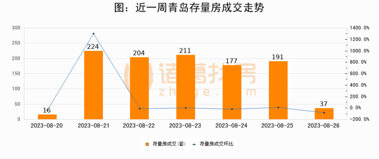 从存量房来看,2023年08月26日青岛存量房单日成交37套,比昨日减少154套,环比下降80.6%。从近一周存量房成交来看,青岛存量房日均成交套数为151套,08月26日单日成交37套,低于近一周平均水平75.5%。