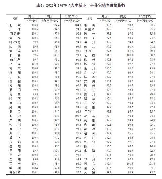 2023年2月70个大中城市二手住宅销售价格指数。 截图自国家统计局官网