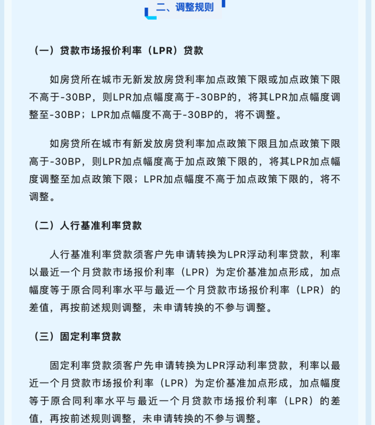 贷款市场报价利率(LPR)贷款方面,如房贷所在城市无新发放房贷利率加点政策下限或加点政策下限不高于-30BP,则LPR加点幅度高于-30BP的,将其LPR加点幅度调整至-30BP;LPR加点幅度不高于-30BP的,将不调整。