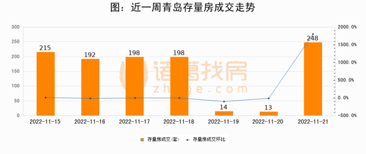 从存量房来看,2022年11月21日青岛存量房单日成交248套,比昨日增加235套,环比上涨1807.7%。从近一周存量房成交来看,青岛存量房日均成交套数为154套,其中11月21日成交量最高为248套,11月21日单日成交248套,高于近一周平均水平61%。