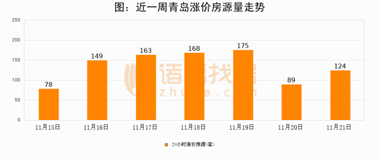 根据诸葛找房数据显示,青岛24小时涨价房源量为124套,较11月20日增加35套,环比上涨39.3%。与此同时,涨价房源占比小幅扩大,业主信心有所提升。