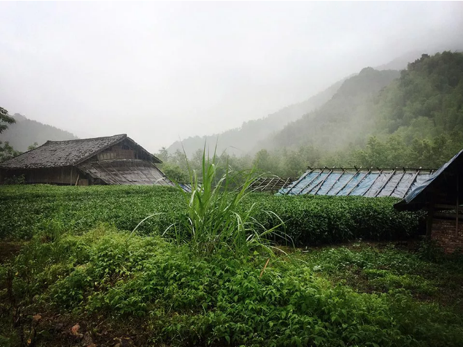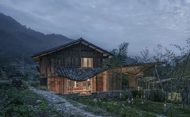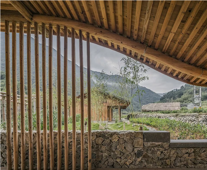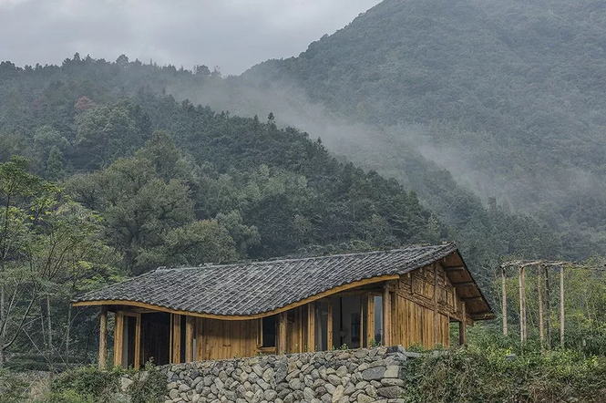 茶室和客房都是在原有的两个羊圈的位置,按照原来羊圈的大小建造的。原来的羊圈虽然是随意搭建的棚子,但是因为时间久了,产生了很自然的弧线屋面,低矮谦逊,和连绵的远山、山间的云雾以及路边的白茶园给人一种自然和谐的感觉。设计茶室和客房时,希望延续这些老结构形成的和周边环境的关系。曲檐的高低起伏,都是被这样一个环境的感染,自然而然形成的设计, 同时也继承了中国南方常见的曲檐传统。保留了老房子朝向村口的方向一面爬满了植被的斑驳的老砖墙。房屋结构采取了传统的榫卯结构与木质围护,使用的大多数材料都是从周边回收的老木料、老门窗。当地工人根据材料的情况,因地制宜,手工加工,设计师也需要根据情况随时调整设计,房屋的每个细节也因此带着人的温度。