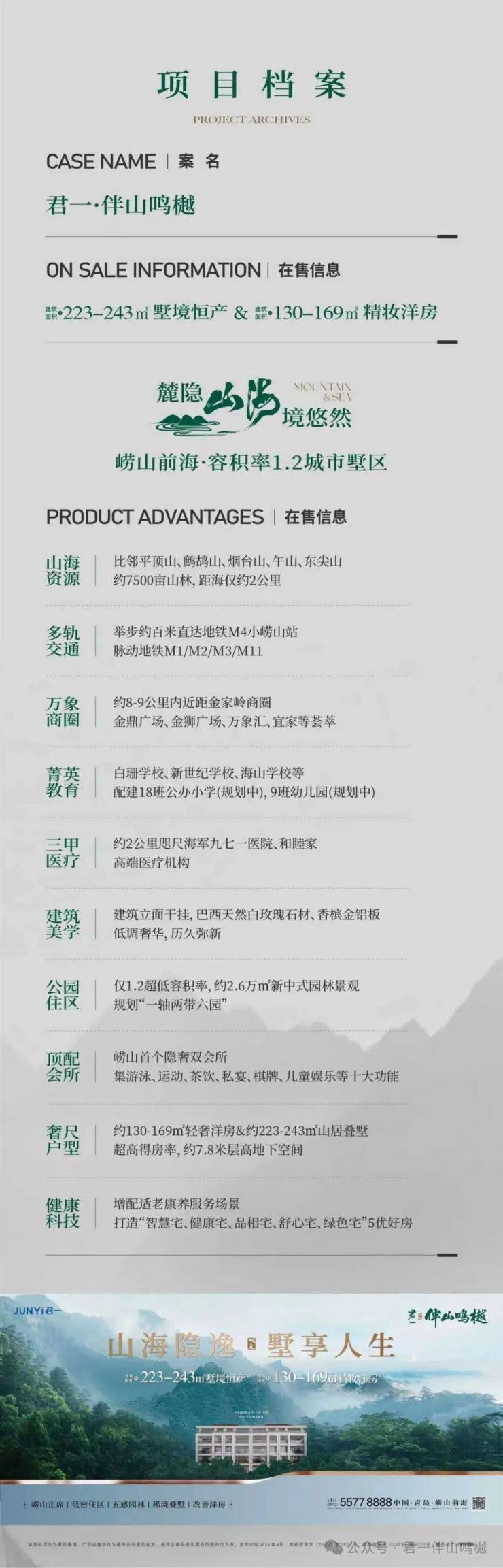 作为崂山前海1.2容积率城市墅区,秉持君一“好房子”筑造标准,君一·伴山鸣樾精研崂山层峰居住习惯,以定制化设计思维,打造「建筑面积约130-169㎡精妆洋房&建筑面积约223-243㎡山居叠墅」。以超高得房率、现代轻奢风格、一线品牌建材与严苛工艺标准,全屋百万级瑧装标准,呈现出超越同级的审美力与价值感。