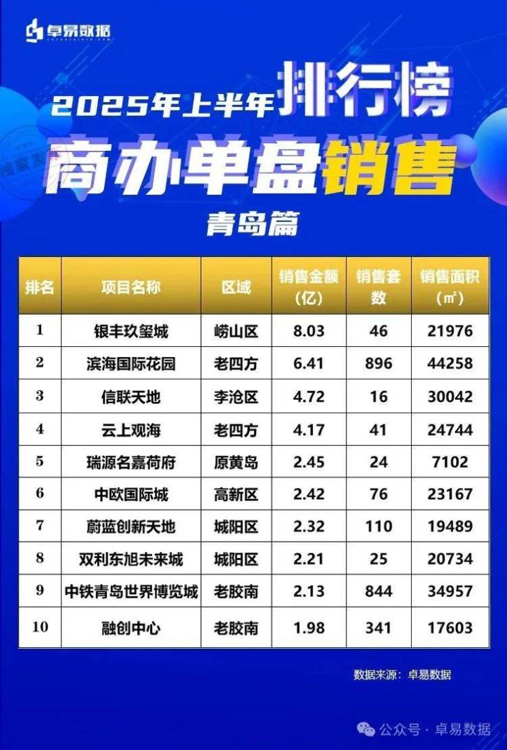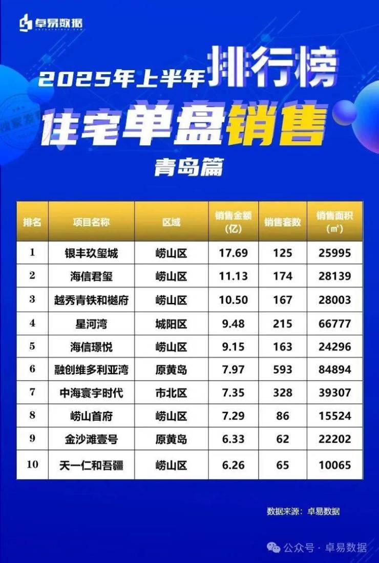 城阳区(含高新区)成交7083套,其中星河湾9.43亿、金茂中欧国际城6.35亿、青特滨湖国际5.39亿、中巍白云山居4.76亿、高实金茂文典府3.73亿。