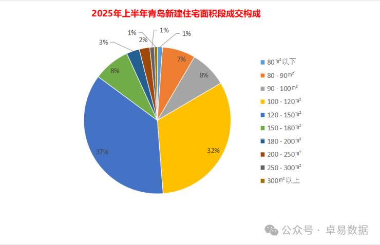 青岛的刚需端收缩,改善和置换需求增长,同时部分刚性需求被二手房和配售型保障房满足。2025年上半年的商品住宅去化中,面积成交结构中,100㎡以下的占比17%,100-120㎡面积段成交最多占比37%,与120-150㎡两个面积段加起来约70%,青岛完全的改善市场。