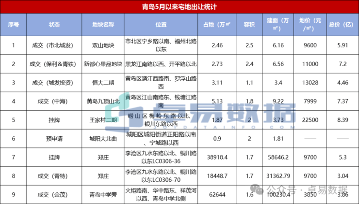 (3)土地市场。青岛上半年共成交101宗,430万㎡(住宅、商业、工业仓储等),成交金额59亿。其中住宅类土地成交8宗,成交49.77万㎡,卖出43.79亿,均为市辖区用地,拿地企业包含金茂、保利、青铁、中海、青特、市北城发、城发投资等等。