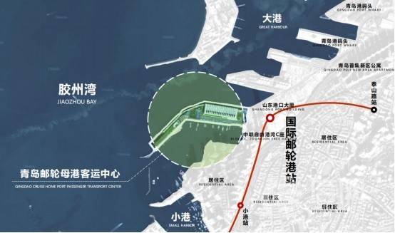 地铁2号线西延段“国际邮轮港站”地下部分与“世界之眼”结合建设,地上则通过空中连廊与邮轮母港客运中心连接。乘客可通过“国际邮轮港站”乘坐国际邮轮。该站点可服务于青岛国际邮轮母港、山东港口大厦和青岛大港海关等,未来去往青岛市图书馆新馆也很方便,有效提升区域交通客运能力和品质城区发展能级,促进“港产城”融合发展。
