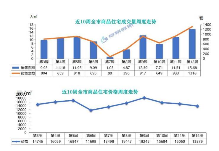 价格方面,上周青岛新建商品住宅均价为13879元/㎡,下降1181元,降幅为7.84%。