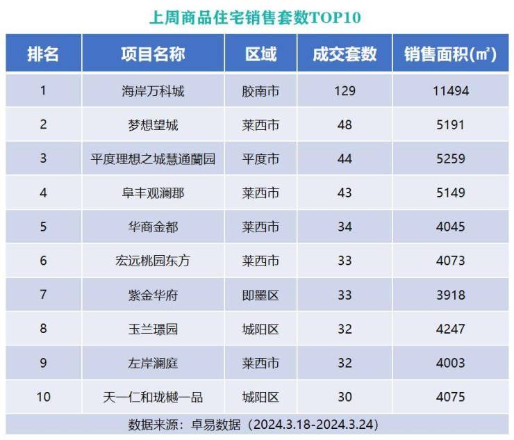 从各项目成交套数来看,位于西海岸新区的海岸万科城以成交129套的成绩列榜单首位;位于莱西市的梦想望城以成交48套成绩上榜第二位;位于平度市的平度理想之城慧通蘭园以成交44套的成绩列榜单第三位。