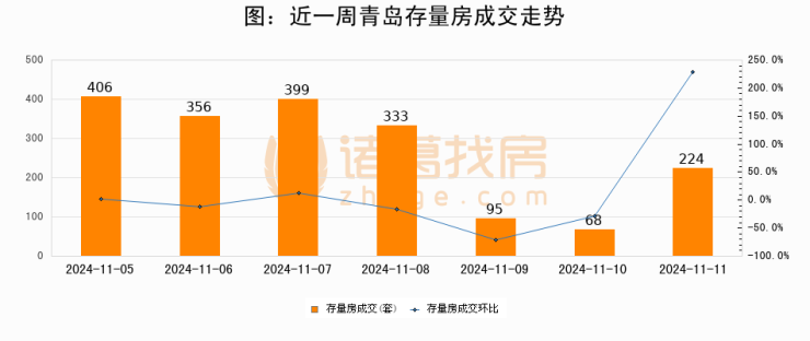从存量房来看,2024年11月11日青岛存量房单日成交224套,比昨日增加156套,环比上涨229.4%。从近一周存量房成交来看,青岛存量房日均成交套数为268套,11月11日单日成交224套,低于近一周平均水平16.4%。